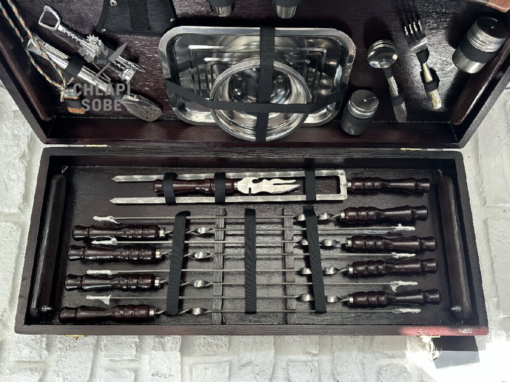 Univerzální BBQ sada „BROOKLYN“ je uložena v elegantním dřevěném kufru, který se snadno promění na skládací stůl. Obsahuje 8 🔗špízů z nerezové oceli (tloušťka 3 mm) s dřevěnou rukojetí , 🔗dvojitý špíz na kuřecí stehna, steaky nebo zeleninu, 🔗víceúčelový grilovací nůž 3v1.