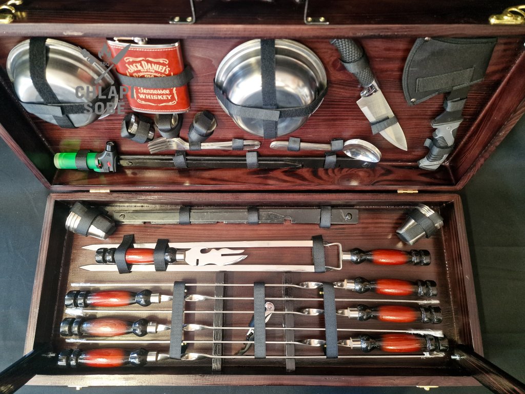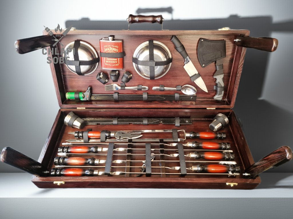 Sada „KRÁL GRILU“ kombinuje styl, praktičnost a funkčnost v jednom elegantním dřevěném kufru, který se během pár sekund promění na plnohodnotný stůl. Výbava uspokojí jak začátečníky, tak i zkušené grilovací mistry.