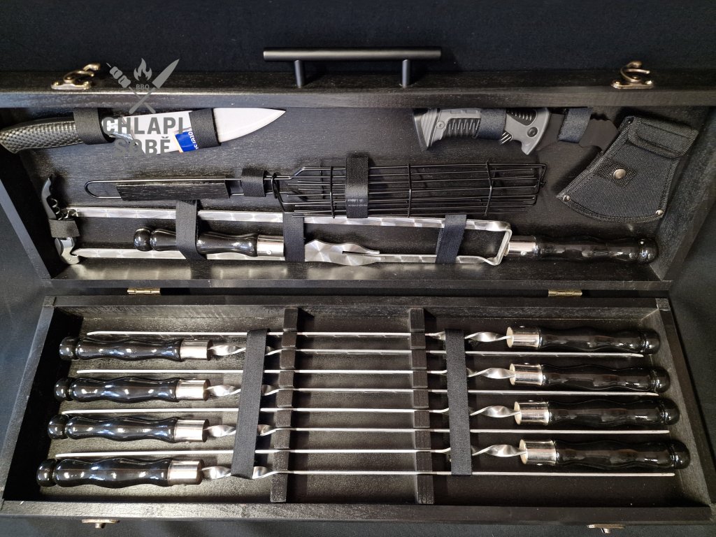 Grilovací sada ,,PROMETHEUS“ v černém dřevěném kufříku s kovovým madlem. Tato sada je ideálním pro každého milovníka BBQ, hodí se na běžné grilování na zahradě nebo i na cestu či piknik. Obsahuje špízy z nerezové oceli, nůž, sekerku, otvírák na vino i pivo, a další...
