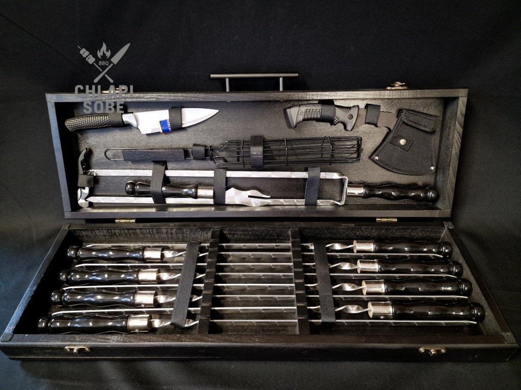 Campingová BBQ sada „PROMETHEUS“ – dřevěný kufr s bytelným madlem