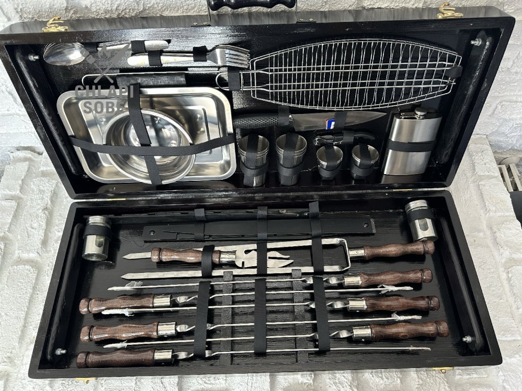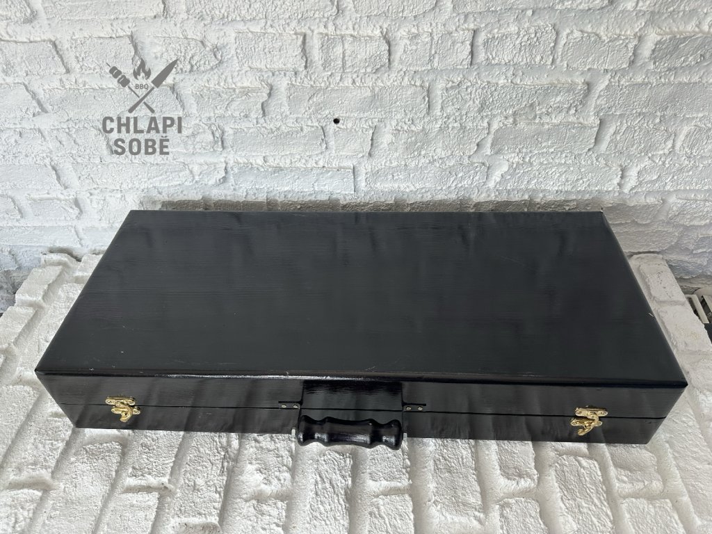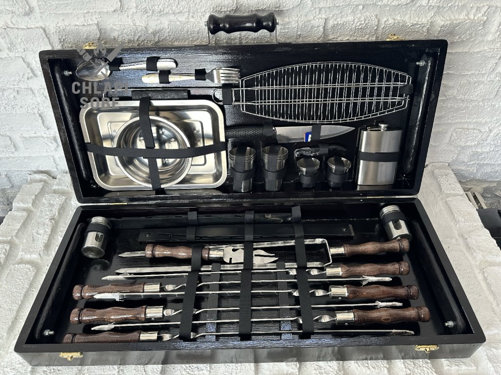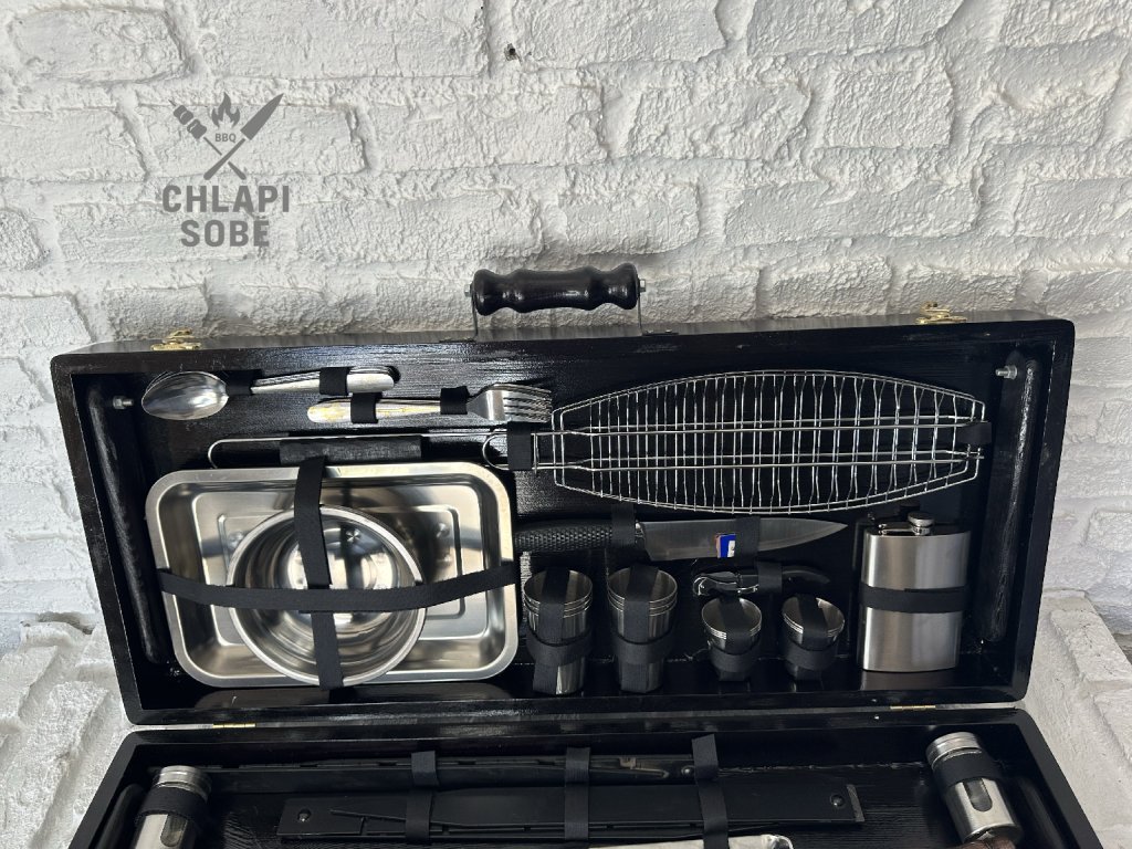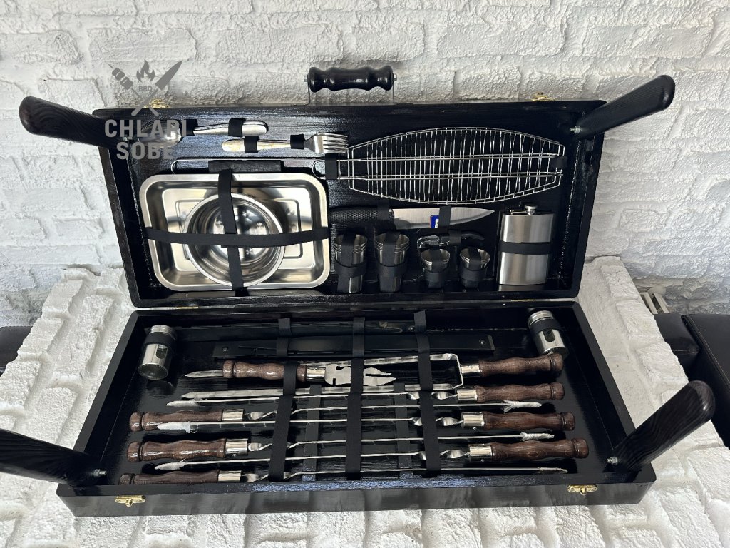 Unikátní grilovací sada „CAMPING“ v přenosném kufru, který se rozkládá do stabilního piknikového stolu. Všechny nástroje jsou uspořádány a připraveny k použití – od designových nerezových špízů se zdobením „jinovatka“ až po příslušenství na servírování. Tento set je ideální volbou pro milovníky grilování na zahradě, v přírodě nebo na cestách. Vhodný i jako luxusní dárek pro opravdové chlapy.