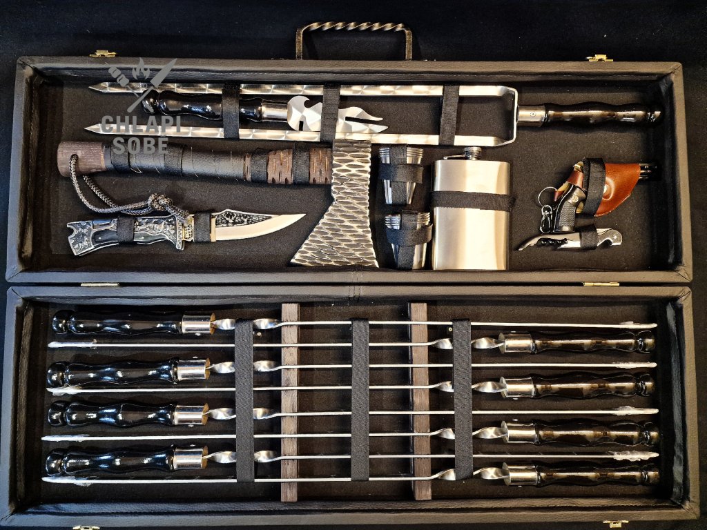 Prémiová grilovací sada v koženém kufru s kovanou rukojetí a elegantními zámky. Obsahuje kompletní výbavu pro pohodlné grilování – včetně ručně kované sekery s kamenitým efektem, nerezových špízů, nerezových panáků, zapalovače a dalšího vybavení.