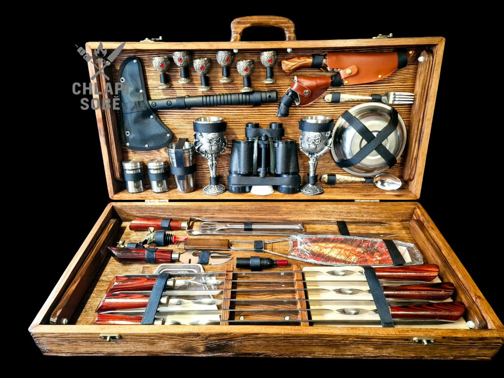 Drákula je campingový kufr plný profi výbavy na grilování a servírování. Rozkládá se ve stul a obsahuje vše, co potřebuješ: od krásného nože, sekery, přes nerezové kelímky, zdobené pohárky, až po misky s příborem. Prakticky uspořádaný, pevný a vždy připravený na akci.