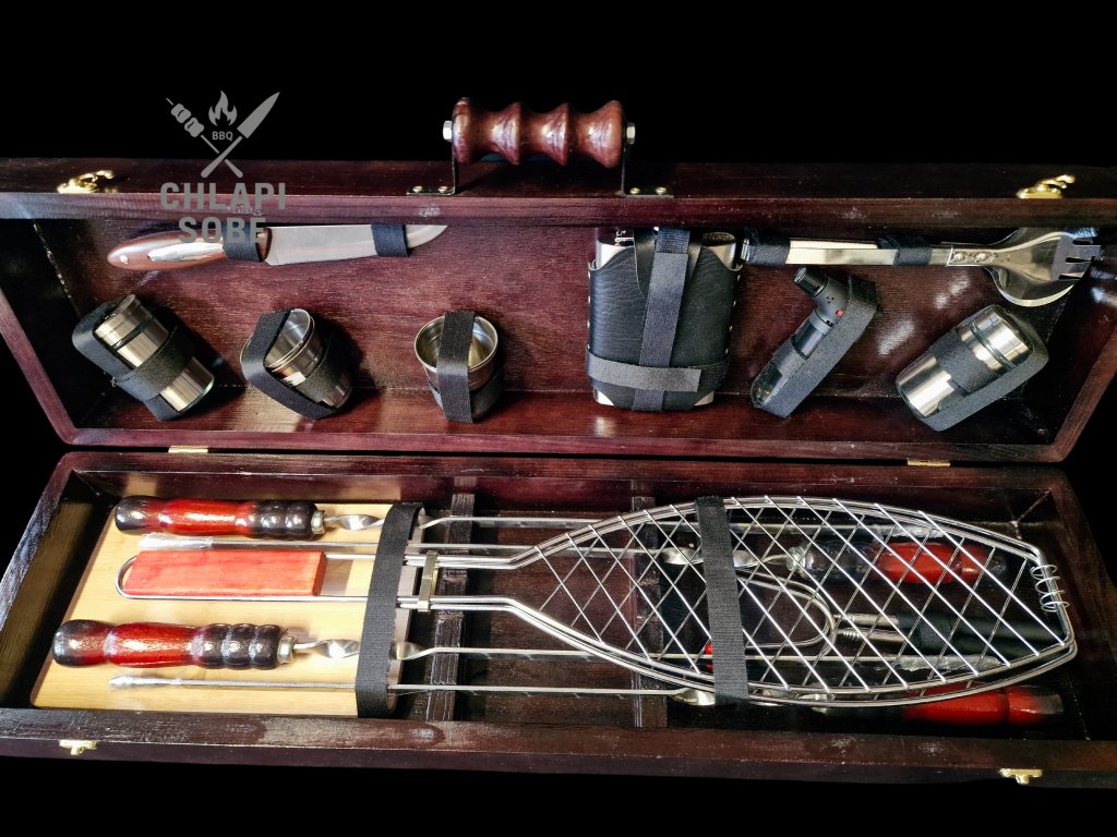 Stylová sada pro milovníky grilování: 6 špízů, mřížka na rybu, maso i zeleninu, kořenky, teleskopické vidlice a další povinnou rybářskou výbavu. Vhodné jak na zahradu, tak do přírody.