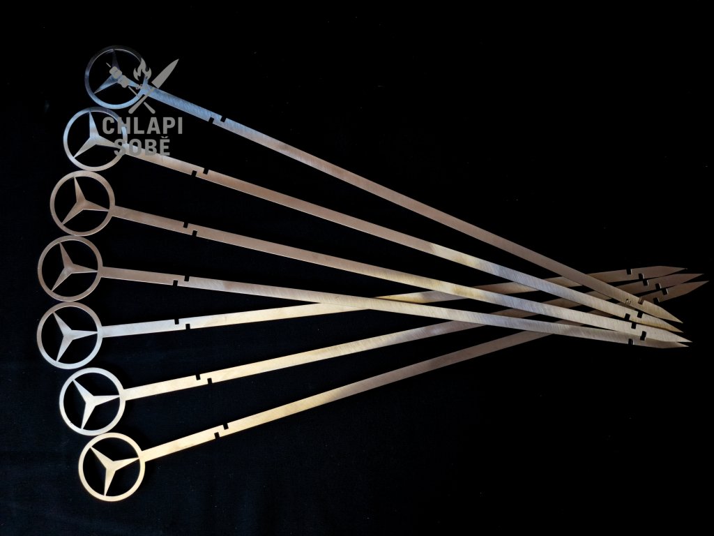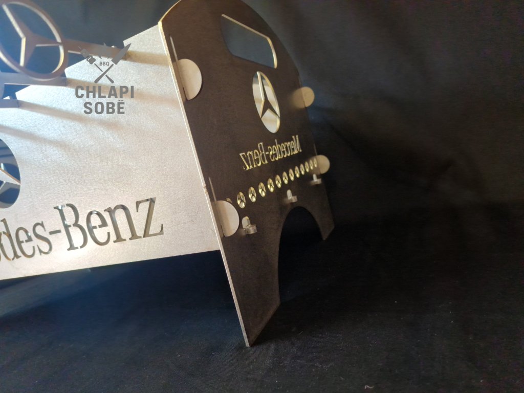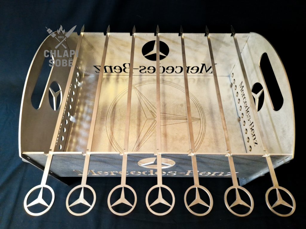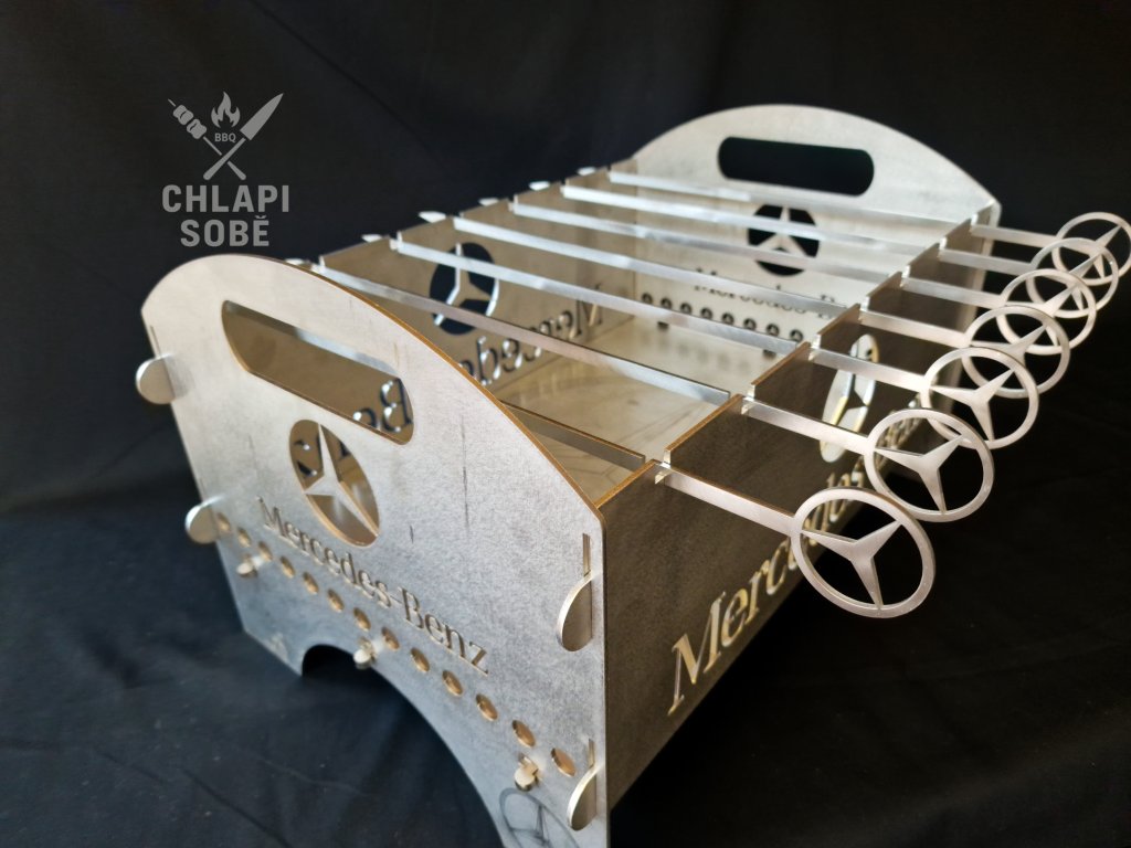 Přenosný a rozkládací ohniště se sedmi špízy. Vše ve stylu Mercedes-Benz. Vše ruční práce. Materiál nerez. Ne jen pro fanoušky Pořádných automobilů.