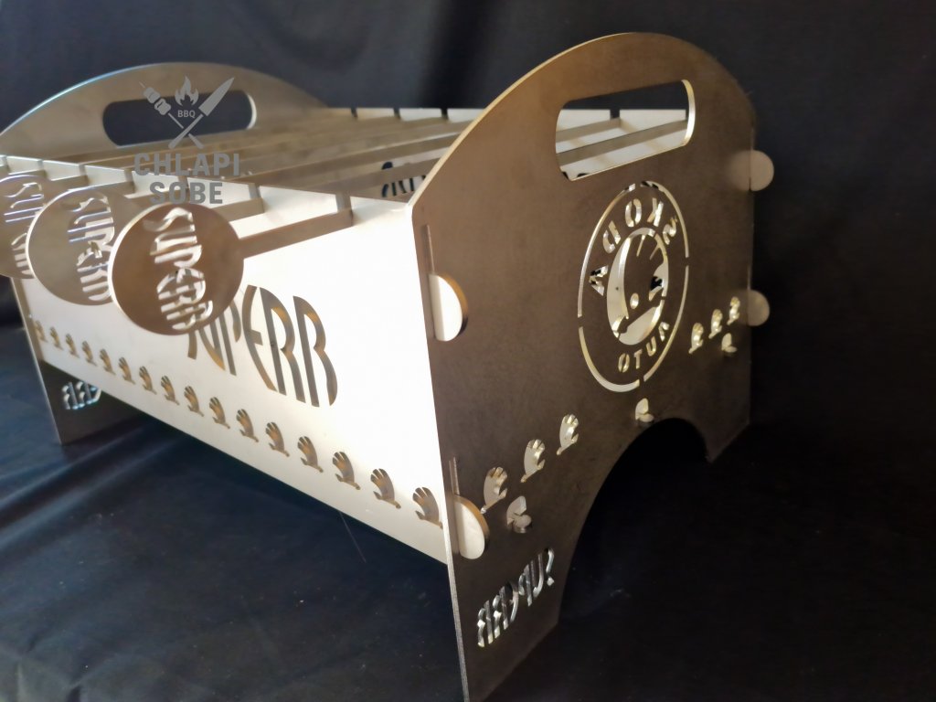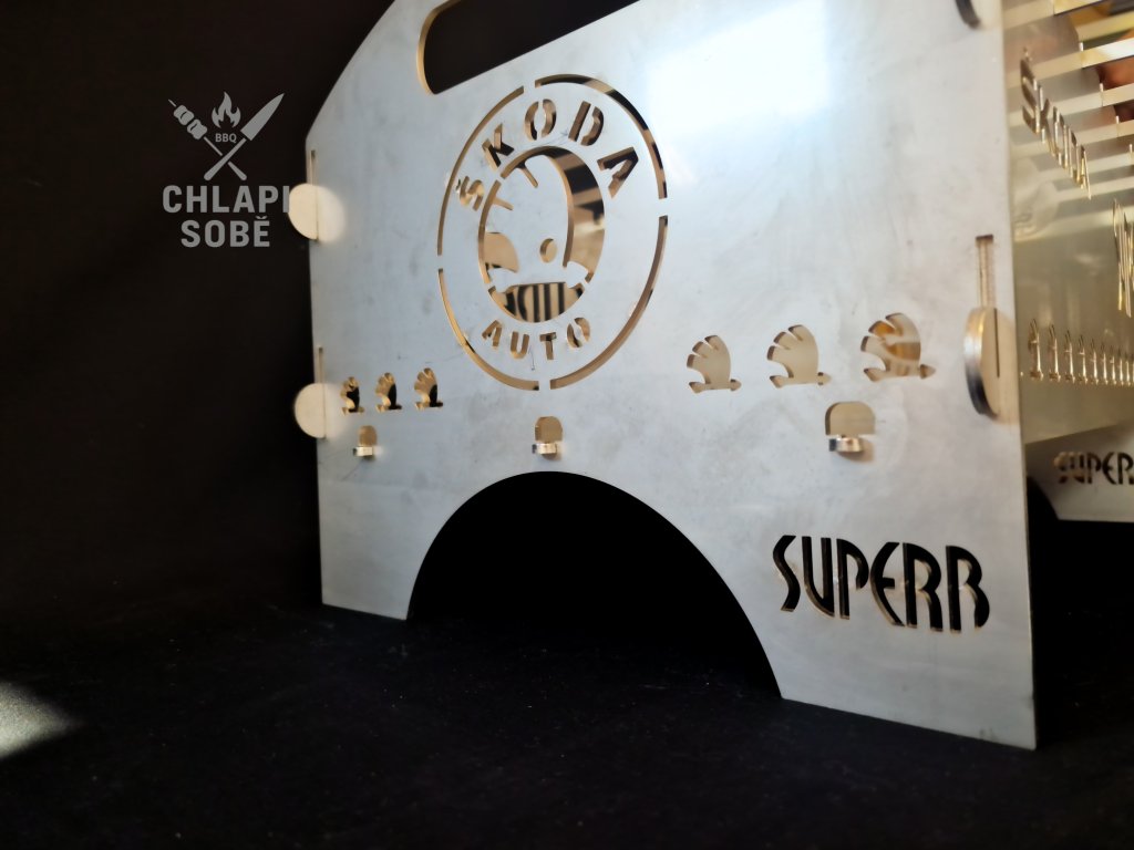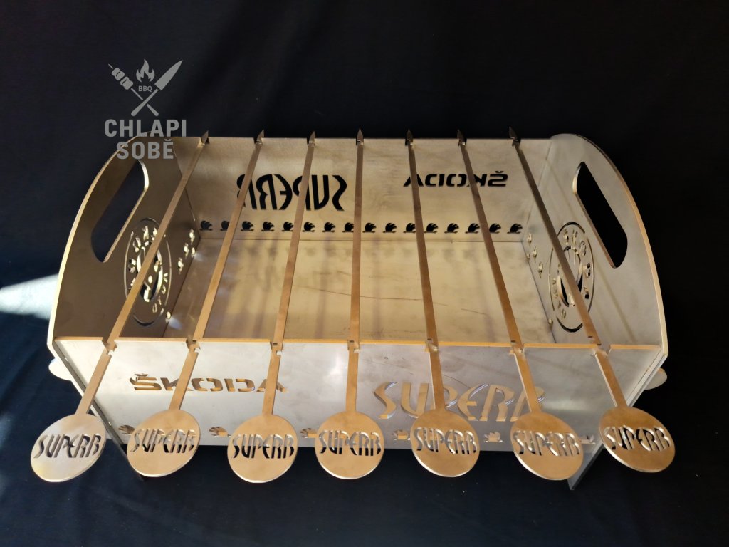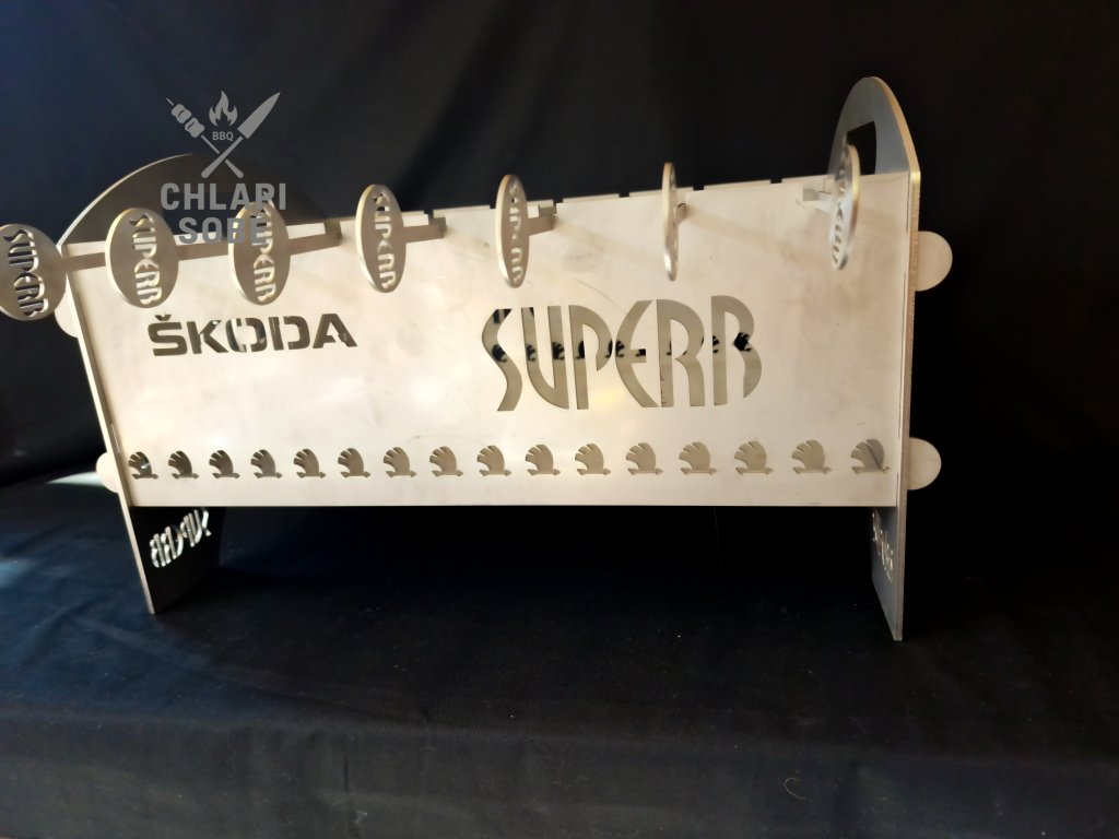 Přenosný a rozkládací ohniště se sedmi špízy. Vše ve stylu Škoda Superb. Potěší nejen fandy a patrioty Škody a všeho co je České.